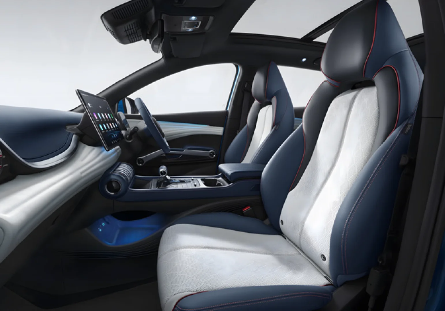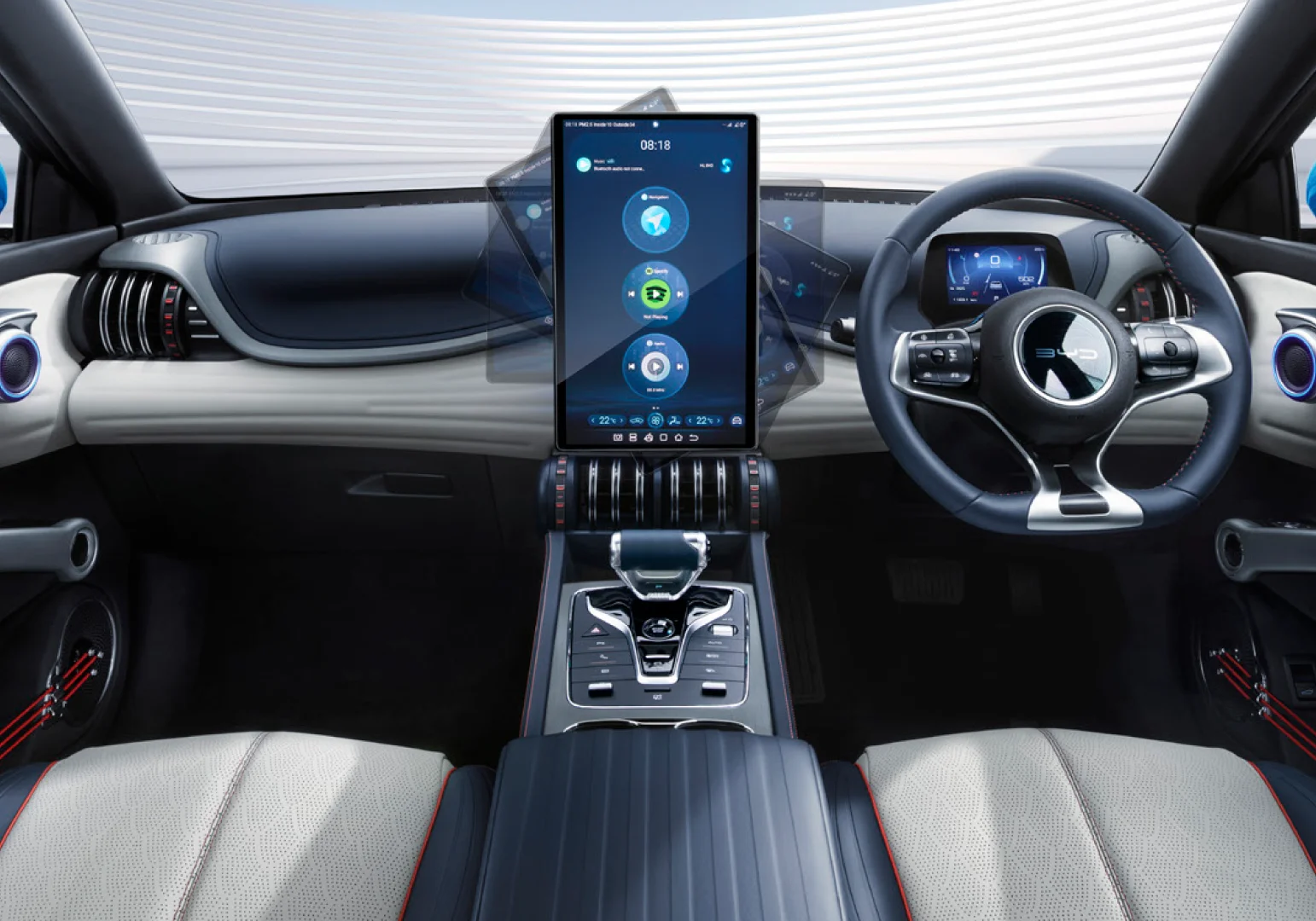 Featuring a large 15.6-inch rotating touchscreen infotainment system, a three-spoke steering wheel, and a compact virtual instrument cluster.